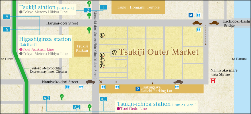 [For those who come by train] -One-minute walk from the Exit A4 of Tsukiji-ichiba Station on the Toei Oedo Line -One-minute walk from the Exit 1 or 2 of Tsukiji Station on the Tokyo Metro Hibiya Line -Five-minute walk from the Exit 5 or 6 of Higashi Ginza Station on the Tokyo Metro Hibiya Line or Toei Asakusa Line [For those who come by bus] -Take a bus bound for Toyomisuisan-futo (都04) at the south exit of Tokyo Station and get off at Tsukiji San-chome -Take a bus bound for Harumi-futo (都05) at the south exit of Tokyo station and get off at Tsukiji san-chome |
